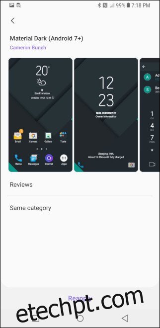 Se você possui um smartphone Galaxy topo de linha, terá acesso à loja de temas da Samsung, que é bastante completa. Esta loja permite alterar os ícones utilizados no launcher da Samsung, as cores dos menus de configurações, do painel de Configurações Rápidas, do aplicativo de mensagens da Samsung, do discador, e outras aplicações do sistema. Também oferece a possibilidade de alterar a aparência dos botões de navegação. Por exemplo, o tema que eu utilizo, chamado Material Dark, faz com que os botões de navegação se pareçam com os de telefones Android convencionais. Além disso, a loja Samsung Themes permite o download de designs distintos para o Always-on-Display, dando-lhe a oportunidade de expressar a sua individualidade, mesmo quando o seu telefone está inativo sobre a mesa.