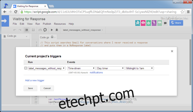 A utilização do script é bastante simples. Após a instalação, basta clicar em “executar” e conceder as permissões necessárias na primeira utilização. Assim que o script é executado, ao visitar a sua caixa de “Enviados” do Gmail, poderá verificar quais e-mails ainda não foram respondidos.