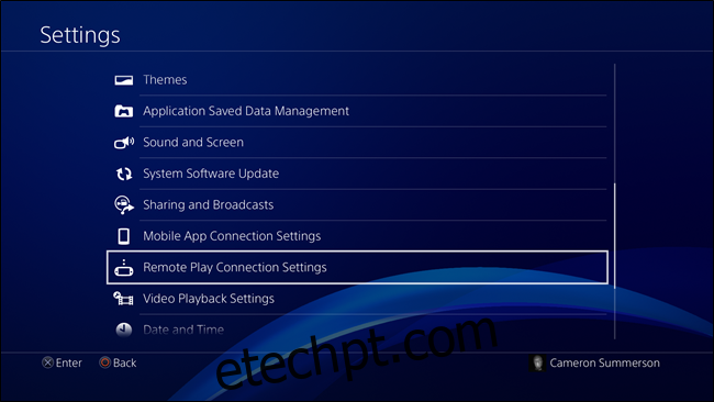Com o aplicativo instalado, ligue seu PlayStation 4 e verifique se o Remote Play está ativado. Vá em Configurações (o ícone que se parece com uma maleta).